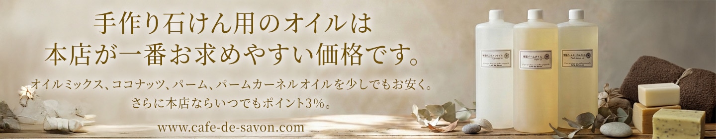 | ■特長 | パームカーネルオイルは、アブラヤシの核から採れるオイルです。 ココナッツオイルに性質が良く似ています。石鹸の泡立ちを良くし、溶け崩れの少ない硬い石鹸を作ります。 ココナッツオイルに比べ、刺激の多いラウリン酸・ミリスチン酸が少ないので、低刺激な代用オイルとして使用できます。 【コンパクトサイズ・500mlはこちら⇒】 |